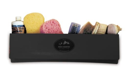 Keep your tools and supplies at arm's distance in your tack room, trailer, garage, wash room, barn, or work shop. The Brush Box is constructed of very durable polyethylene plastic and is UV protected so it won't fade in sunlight. It mounts easily to any flat surface by using screws in each of the witness marks around the edge of the product. Size: 28" L x 5" W x 7" H Weight: 1 pound