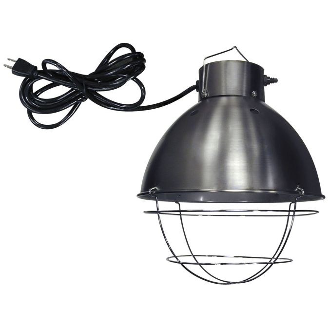 Provides chicks with a warm, dry environment. Heat resistant ceramic socket and double wire bulb guard for safety. Features 6 foot electrical cord with polarized male prongs and scratch-resistant clamp with ball joint for easy positioning. Corrosion-resistant 10.5 inch aluminum shade has a built-in hanger. Uses 300W bulb maximum, sold separately.