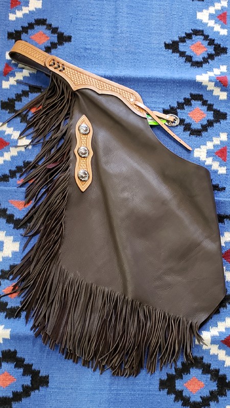 These chinks have a wrap around your leg and come with basket weave tooled yolks and have buckle leg straps