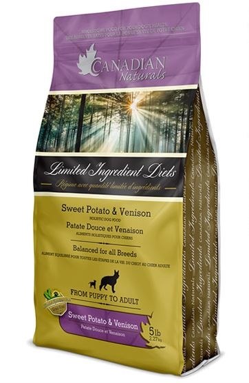 Canadian Naturals LID Sweet Potato & Venison Recipe is a great food for dogs with food allergies and sensitive digestive tracts. The simple ingredient list includes venison as the single animal protein source. In addition, sweet potato provides great flavour and is easy for dogs to digest. It is a low-glycemic carbohydrate that has been substituted for grains in this formula. The mix of vitamins, minerals, and Omega 3 and 6 fatty acids ensures that your dog is receiving a quality, balanced diet. Made in Canada. Appropriate for dogs of all breeds and life stages.