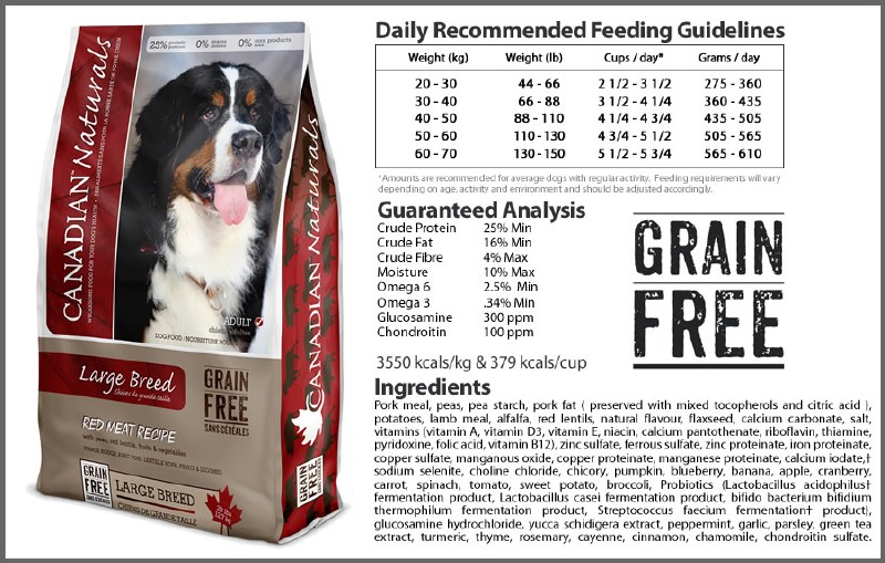 Canadian Naturals Grain Free Large Breed Red Meat Recipe is made with real pork and lamb to create a delicious, quality dog food at a reasonable price. Rather than using grains and other fillers, this recipe incorporates alternative carbohydrate sources such as peas, red lentils, and potatoes. This tasty formula provides a well-rounded diet specifically for large breed dogs and all life stages. It is also an excellent choice for dogs with sensitive stomachs or allergies.