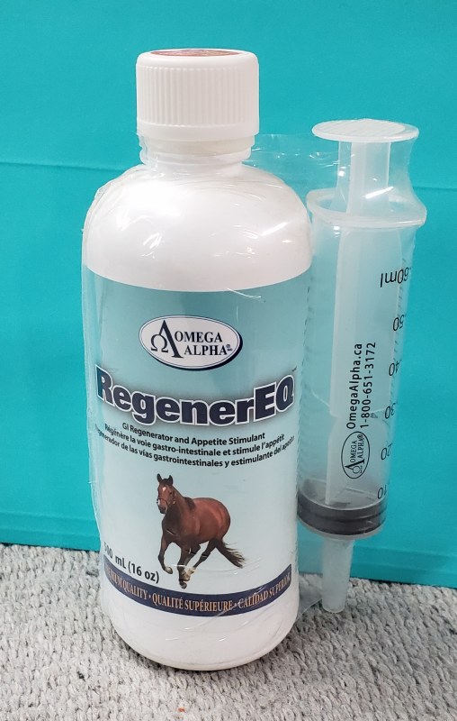 RegenerEQ™ GI Regenerator and Appetite Stimulant Ingredients: Fraction 23, Sunflower Oil, Flax Oil, Mixed Tocopherols, Silica. Initial Serving: 15 mL (½ oz) twice daily, given orally. Maintenance Serving: 15 mL (½ oz) once daily, given orally. Always administer by serving syringe. CAUTION: Oral use only. Shake well before use. Not recommended for mares in foal. RegenerEQ™ is manufactured under strict GMP standards. This information is not intended to diagnose or treat health conditions. We always recommend consultation with your veterinarian for proper diagnosis.